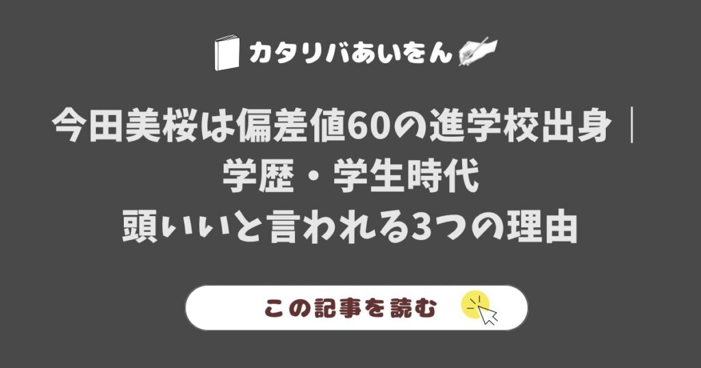 今田美桜は偏差値60の福岡県立筑前高校出身で大学非進学。 学生時代は吹奏楽部でフルート担当。 頭いいと言われる理由は学歴ではなくバラエティでのコメント力・SNS戦略・地頭の良さ。 42歳高卒ライターが学歴に頼らない成功法則を実体験で解説。 今田美桜... トレンド・芸能