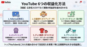 YouTube収入源は、AdSense広告収入だけではありません。他に、企業案件(タイアップ・PR動画)、スーパーチャット(ライブ配信での投げ銭)、メンバーシップ(月額課金制ファンクラブ)、グッズ販売、アフィリエイト(商品紹介リンク)などがあります。